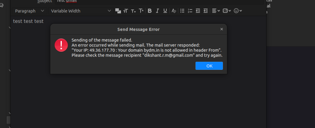 This error was showing up when I tried to send the email from freelance@bydm.in and email@bydm.in.