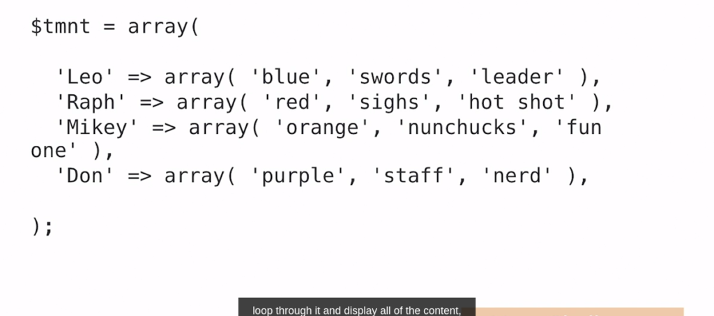 'Mikey' => array( 'bandana' => 'orange','weapon' => 'nunchuncks', 'role' => 'fun one'),